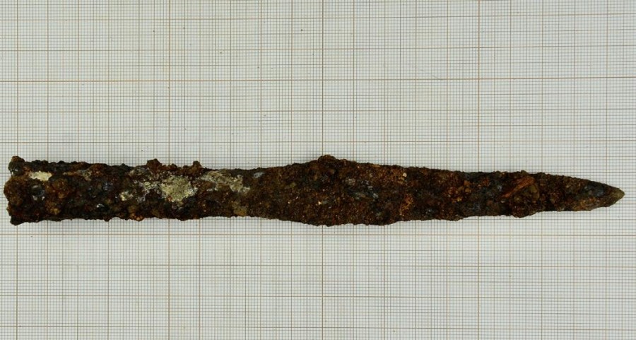 Nur in einem der Gräber fanden sich Beigaben. Das erscheint vielleicht verwunderlich, doch für Alt Wartenburg ist dieses Grab eher die Ausnahme, die meisten Toten wurden hier ohne weitere Beigaben bestattet. In diesm Grab fanden sich neben den Skelettresten unter anderen ein Bauernwehr. Es ist allerdings nicht der erste Bauernwehr, der in Alt Wartenburg gefunden wurde. In der Ausgrabung gibt es zahlreiche sogenannte Messerdolche, auch Bauernwehr genannt. Die in Alt Wartenburg gefundenen Exemplare sind etwa 35 - 40 cm lang. Das sind große, massive Messer mit einer Klinge und einem Griff mit einer charakteristischen „Parierstange“, um den Daumen zu schützen. Bei einem Bauernwehr handelt es sich um ein universelles Gerät, welches sowohl als Werkzeug als auch als Waffe verwendet werden konnte.
