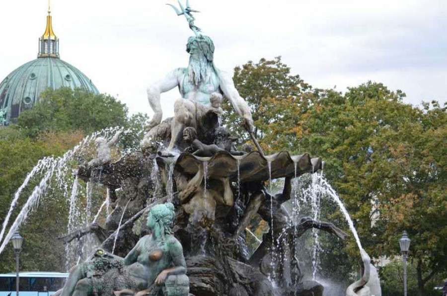Der neobarocke Neptun-Brunnen - ein Geschenk Berlins für Wilhelm II. - wurde ursprünglich auf dem Schlossplatz errichtet. Umgeben von Meerestieren trägt eine große Muschelschale den Meeresgott mit seinem Erdbeben auslösenden Dreizack. Die auf dem Brunnenrand sitzenden Bronzestatuen personifizieren die vier großen Ströme Preußens: Rhein, Weichsel, Oder und Elbe. Um den Meeresgott ranken sich mythische Legenden - über den Unterwasserpalast, seine weißen Zauberpferde mit goldenem Wagen, „bei dessen Nahen Stürme sich legen und Meeresungetüme tanzend sich um ihn erheben.“ (Robert von Ranke Greves). Dem antiken Meeresgott zu Ehren finden Festumzüge statt und auf dem Marsfeld in Rom ist ihm ein Tempel gewidmet. Der Überlieferung nach schleuderte er in Griechenland, als er Attika erleuchtete, seinen Dreizack in die Akropolis von Athen. Die Quelle, die sich dadurch aus dem Seewasser emporhob, soll noch immer aktiv sein.