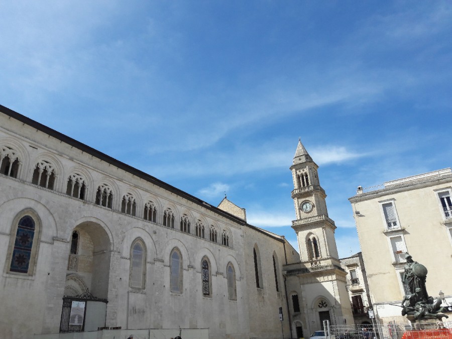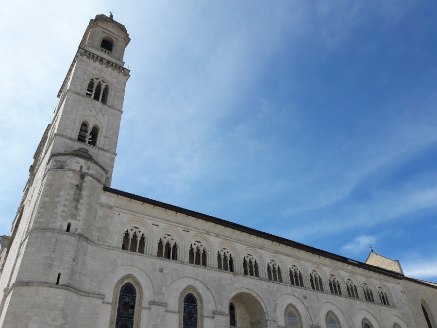Eine der beeindruckendsten mittelalterlichen Kathedralen befindet sich in Altamura in der Provinz Bari (Apulien, Süditalien). Die Kathedrale wurde 1232 von Friedrich II. Erbaut, während er in der Stadt geboren wurde. Im Jahr 1316 wurde es teilweise durch ein Erdbeben zerstört und etwa ein Jahrhundert später wieder aufgebaut. Es ist ein architektonischer Komplex, der aus einer Reihe gut aufeinander abgestimmter Stilelemente besteht, die einen Effekt von Perfektion und Majestät vermitteln. Ursprünglich im romanisch - apulischen Stil, wie die rechte Seite zeigt, die durch sieben Bögen bereichert und mit einem schönen Portal geschmückt ist, das vom Souverän Robert von Anjou errichtet wurde.