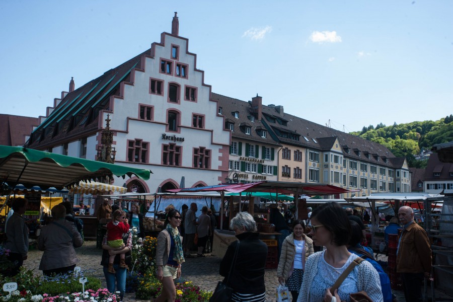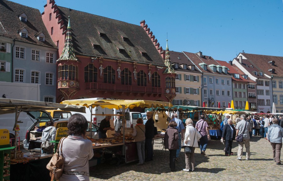 Das Historische Kaufhaus, ein eindrucksvolles Gebäude mit roter Fassade liegt an der Südseite des Münsters. Vier Arkaden weisen zum Münster. Spätgotische Vorhangbogenfenster und Erkertürme vervollständigen dieses wunderschöne Gebäude. 1400 diente es dem Warenumschlag und der Zollabwicklung. Auf der Nordseite des Münsterplatzes befindet sich das Kornhaus. Ursprünglich diente es dem Handel mit Getreide. Es wurde aber auch als Tanz- und Festsaal für Kaiser Maximilian I. verwendet, lange Zeit befand sich auch ein Schlachthaus im Gebäude. Um dem Münsterplatz findet montags bis samstags ein Wochenmarkt statt. Die Aussteller bieten jedem etwas, dem Einheimischen und den Besuchern. Wer fremd ist, sollte hier die Freiburger lange Rote versuchen. Eine schmackhafte Wurstspezialität aus dem Breisgau.
