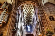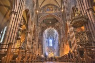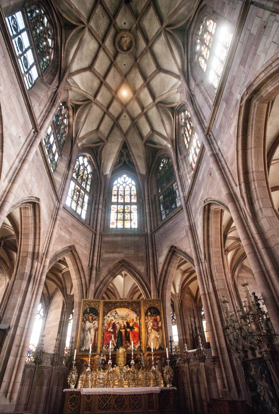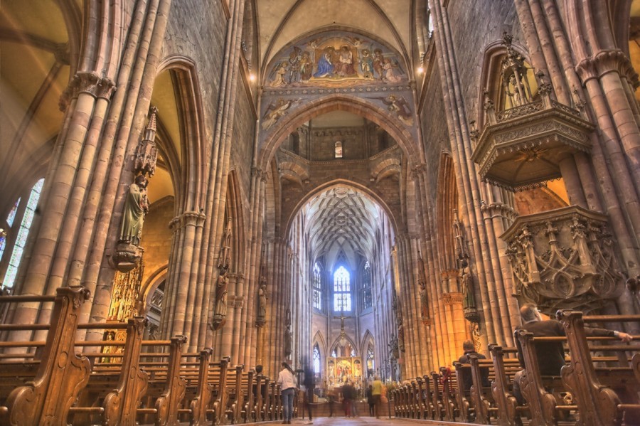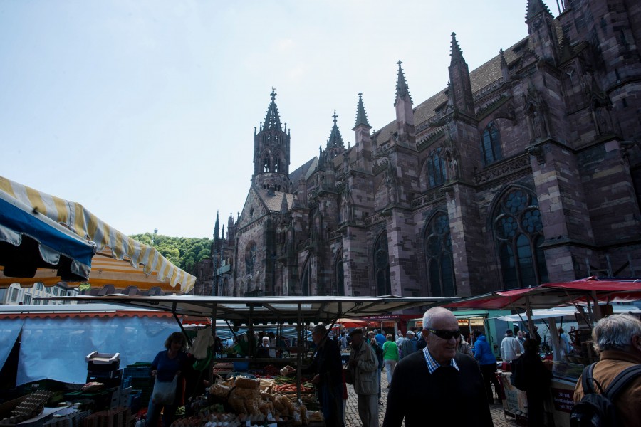 Das Innere des Freiburger Münsters macht den Besucher sprachlos. Herrliche Skulpturen an den Seitenwänden und im Tympanon über dem Eingangsportal. Herrliche Lichtspiele durch die bunten Glasfenster der Südseite. Einige der Fenster, durch die das Licht in das hohe Kirchenschiff fällt, stammen noch aus der Zeit um 1320. Handwerker der verschiedensten Gewerbe, Freiburger Zünfte und Bergleute, machten einen Wettbewerb um das schönste Seitenfenster daraus. Wer genau hinschaut, erkennt noch die Symbole der Gewerbe. Schaut man aus dem Kirchenschiff den Hochchor hinauf, erblickt man die Fenster mit dem Reichsadler und den Wappen der Habsburger. Weltbekannt ist 116 Meter hohe Westturm des Münsters. Wer gut zu Fuß ist, kann über 329 Stufen bis zur obersten Plattform gelangen. Von dort hat man einen phantastischen Blick über die Dächer Freiburgs, den Markt bis zum Schwarzwald und in die Vogesen.