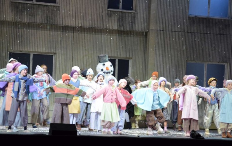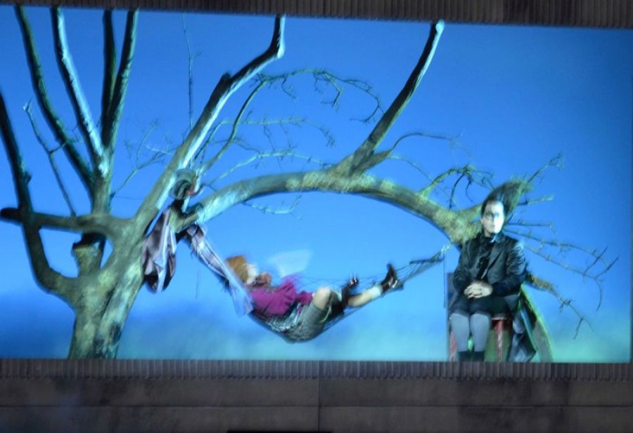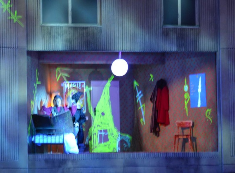 In der Inszenierung der Komischen Oper mit phantastischen Kostümen „brummt die Posaune voll Gemüt, die Tuba kommentiert trocken, die Klarinette jault auf und die gestopfte Trompete wimmert verschämt.“ (Clemens Haustein, Frankfurter Allgemeine Zeitung) Die entzückende Schauspiel-und Gesangsvirtuosin Maria-Danaé Bansen,d ie die kleine Hexe verkörpert, wohnt zusammen mit dem Raben Abraxas in einem modernen Plattenbau. Statt Wäscheklammer lässt sie gelbe Gummistiefel regnen, die sie auf dem verschneiten Marktplatz eintauscht, auch für einen neuen Reisigbesen. „Doch neue Besen sind wie wilde Pferde, sie müssen erst gezähmt und zugeritten werden.“ Derweil beschattet ihre Muhme, die Wetterhexe Rumpumpel, die kleine Hexe und notiert alle gute Taten, die vor dem Hexen Rat gerügt werden könnten, als Verfehlungen. Rumpumpel droht sogar, alle Kinder aus dem Publikum in Fledermäuse zu verwandeln. Diese jedoch lassen sich von ihr nicht einschüchtern.