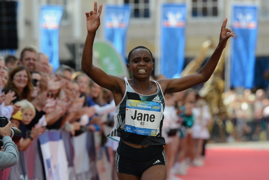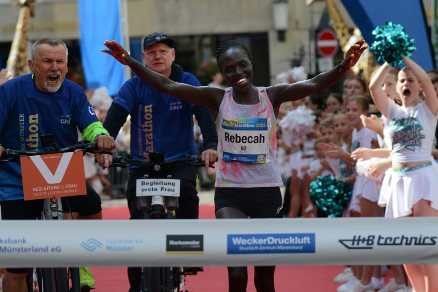Endlich war er da, der langersehnte Streckenrekord, auf den alle mit Spannung gewartet hatten. Michael Brinkmann, der Organisationsleiter, spürte, wie ein schwerer Stein von seinem Läuferherzen fiel. "Puh! Ich war wirklich nervös", seufzte er, "aber es hat fantastisch geklappt." Hendrik Pfeiffer hatte mit seiner hervorragenden Leistung den Weg geebnet. Charles Muneria, gerade einmal 1,67 Meter groß und 57 Kilogramm leicht, nahm diese Vorlage dankbar an und zeigte eiskalte Nerven. Bei den Frauen siegte Rebecah Jeruto Cherop in beeindruckenden 2:29:13 Stunden. Das Gesamtpodest des Marathons wurde durch Jane Moraa Onyangi (2:30:06 Stunden) und Judith Cherono (2:35:24 Stunden) komplettiert, wobei alle sechs Topplatzierten kenianische Athleten waren.